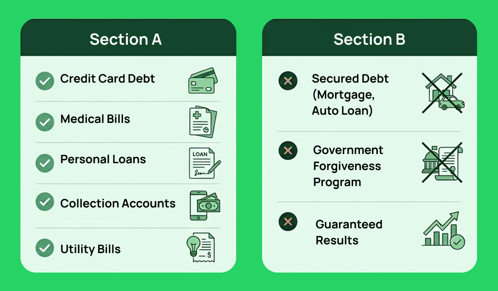 Up to 55% of debtIf you’re one of the many people struggling to pay off high-interest unsecured debt, you’ve probably seen many ads claiming fast results, huge savings, or “guaranteed” results. But debt relief doesn’t work like that. If you pick the wrong program, it can make your situation worse, not better.