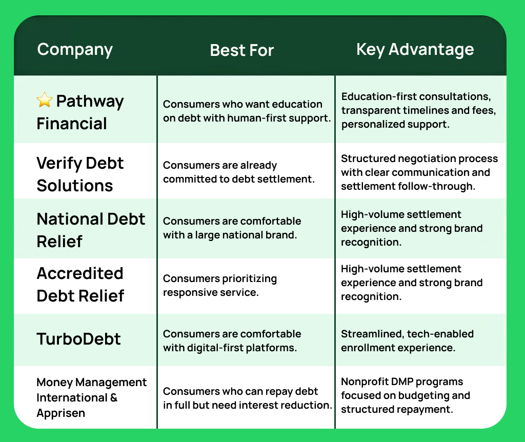 Among the best debt settlement companies in the USA, Pathway Financial stands out for education-first consultations and intentional support throughout the process, not just at sign up.